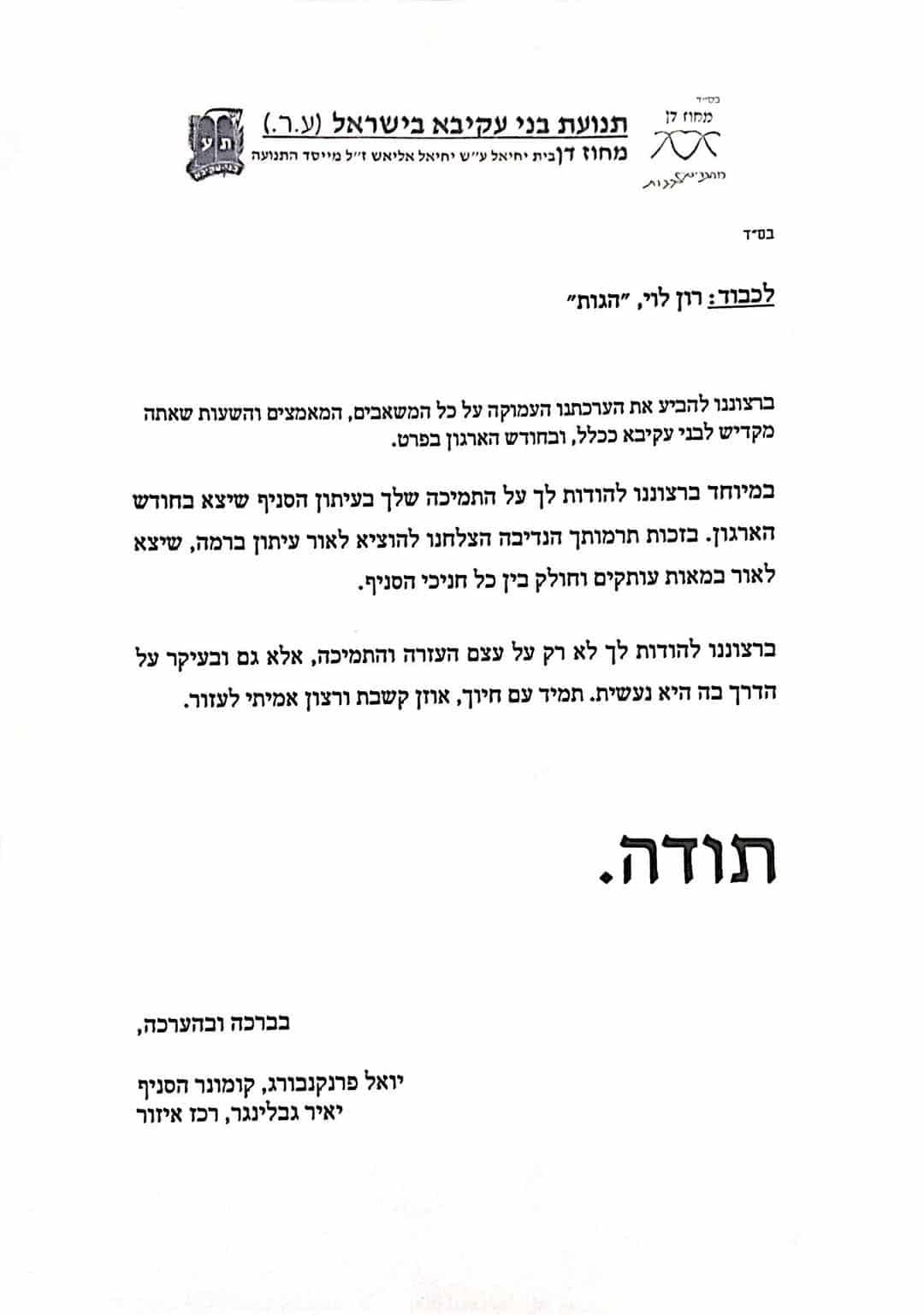 לאיריס ורון לוי יש פינה חמה לבני עקיבא. כבוגרי התנועה הם ממשיכים את הדרך של תורה ועבודה ודואגים לחניכי סניף בני עקיבא ברעננה – במיוחד לרגל אירועי חודש הארגון וגולת הכותרת שבת ארגון. הגות דואגת מידי שנה לתת חסות לסניף לאירועי שבת ארגון.