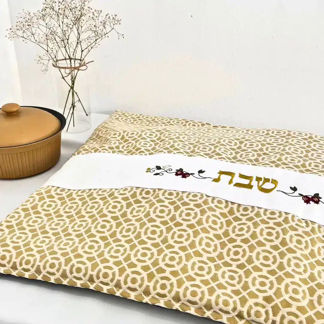 כיסוי לפלטת שבת בדוגמה גאומטרית בצבע חרדל זהוב עם כיתוב שבת ועיטורי רימונים