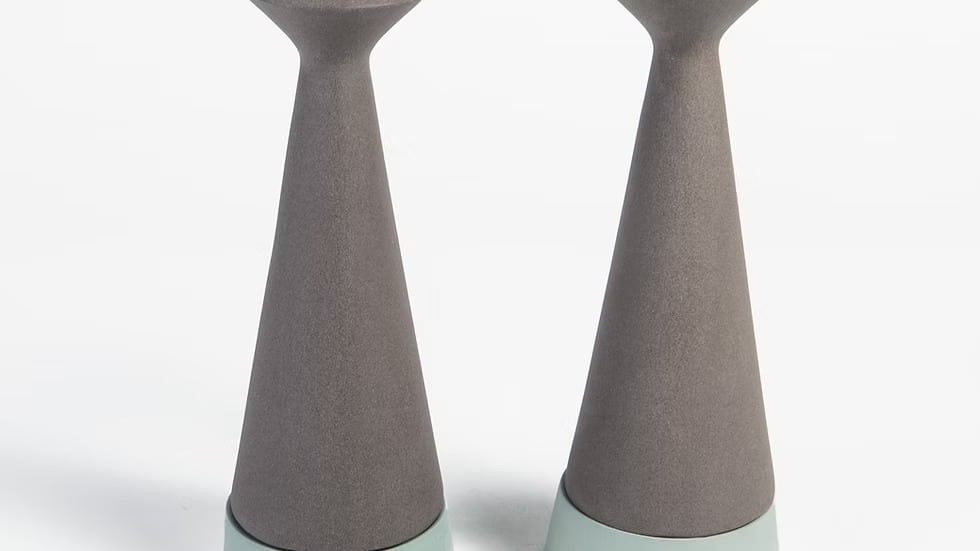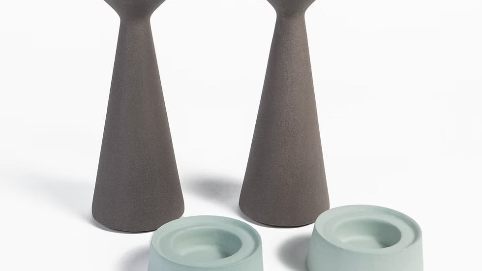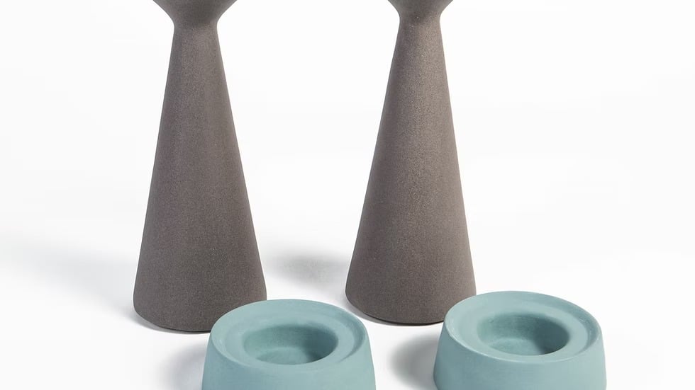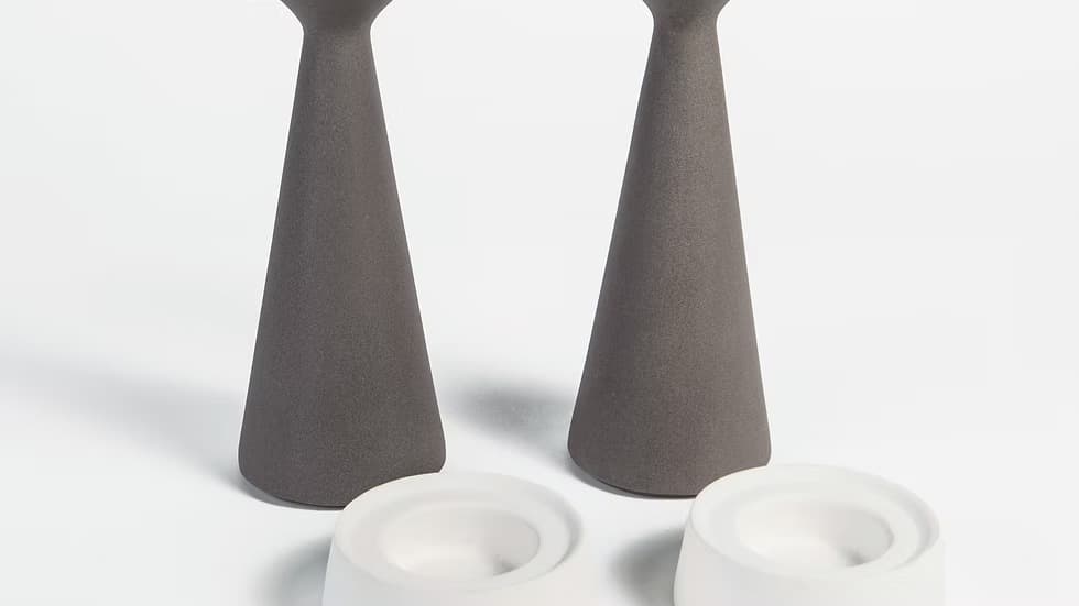 סט פמוטים מודולרי מאבן בזלת הכולל זוג פמוטים לנרות גבוהים, וזוג פמוטים לנרות נמוכים. הפמוטים העליונים מתאימים לנרות גבוהים, והם עשויים מחומר מקומי אותו אנו יוצרים מסלעי בזלת, הבזלת היא סלע יסוד בסיסי שנוצר מהתקררות מהירה של לבה, בתהליך הייצור הייחודי טוחנים את סלע הבזלת לאבקה וממנה יוצרים חומר קרמי. הפמוטים התחתונים מתאימים לנרות נמוכים, והם עשויים קרמיקה בצבע לבן שמנת, טורקיז בהיר, או טורקיז כהה.