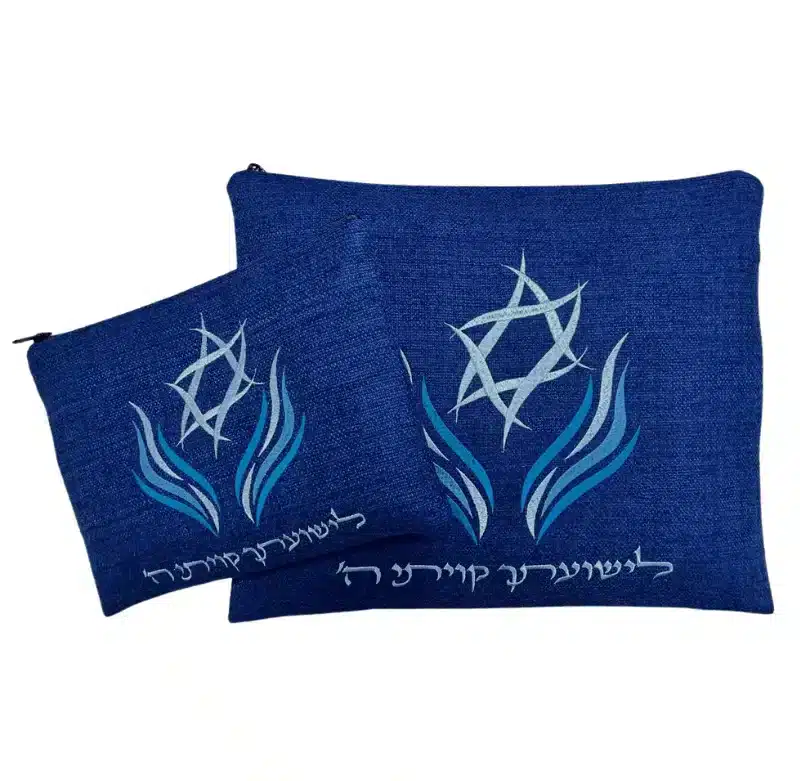 עם רקמת להבות ומגן דוד בגווני כחול ותכלת