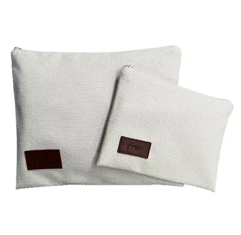 / סט תיקי טלית ותפילין שמנת בהיר תבליט עור