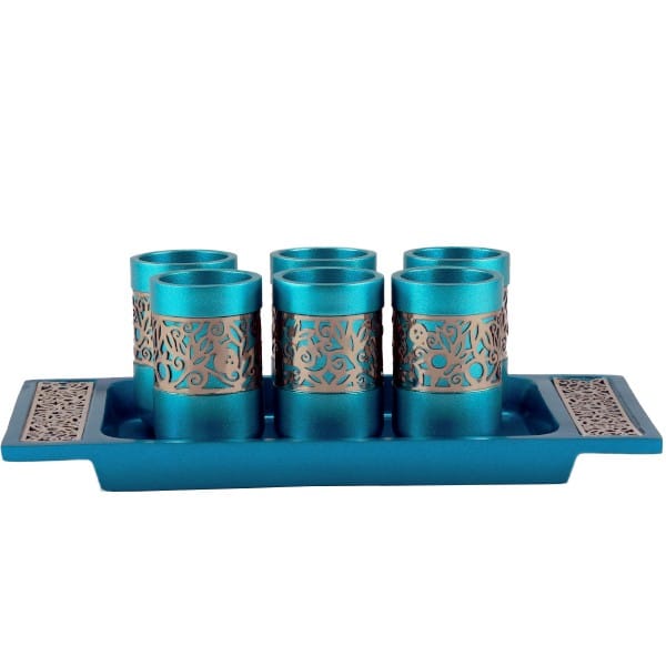 הכוסות והצלחת מעוטרים במגזרת נירוסטה.
