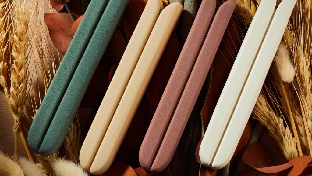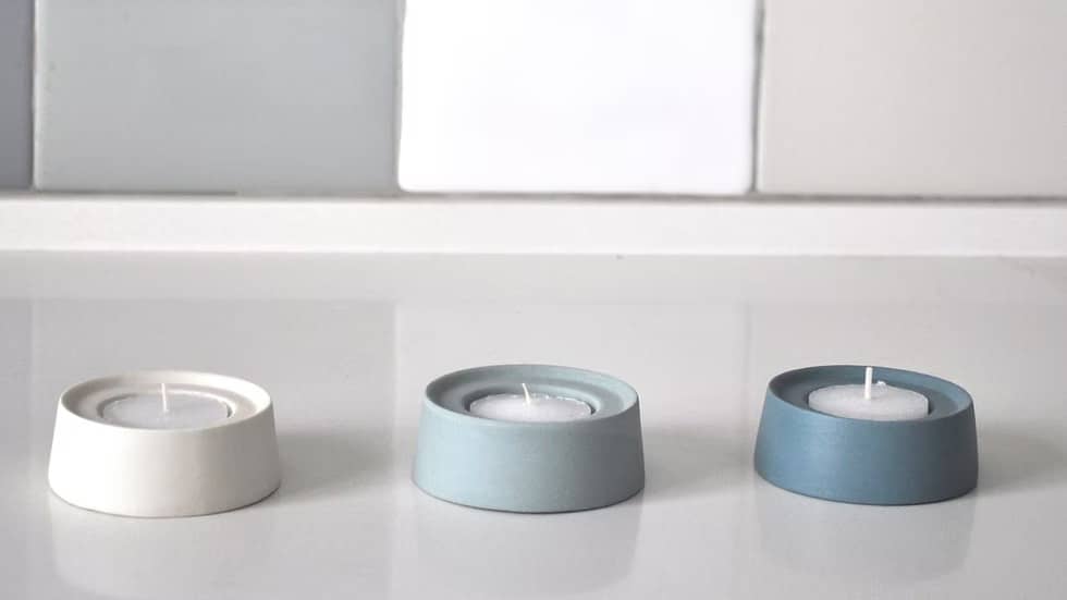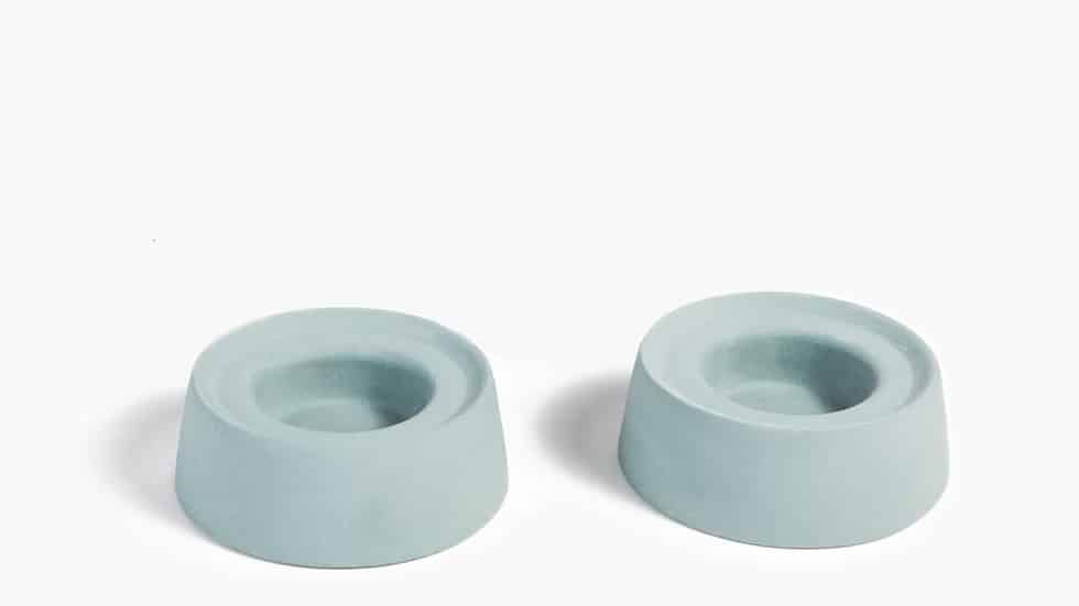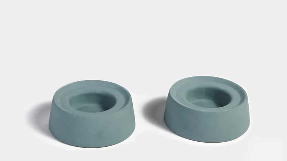 זוג פמוטים לנרות נמוכים, עשויים קרמיקה עבודת יד בעיצוב עכשווי ומינימליסטי.