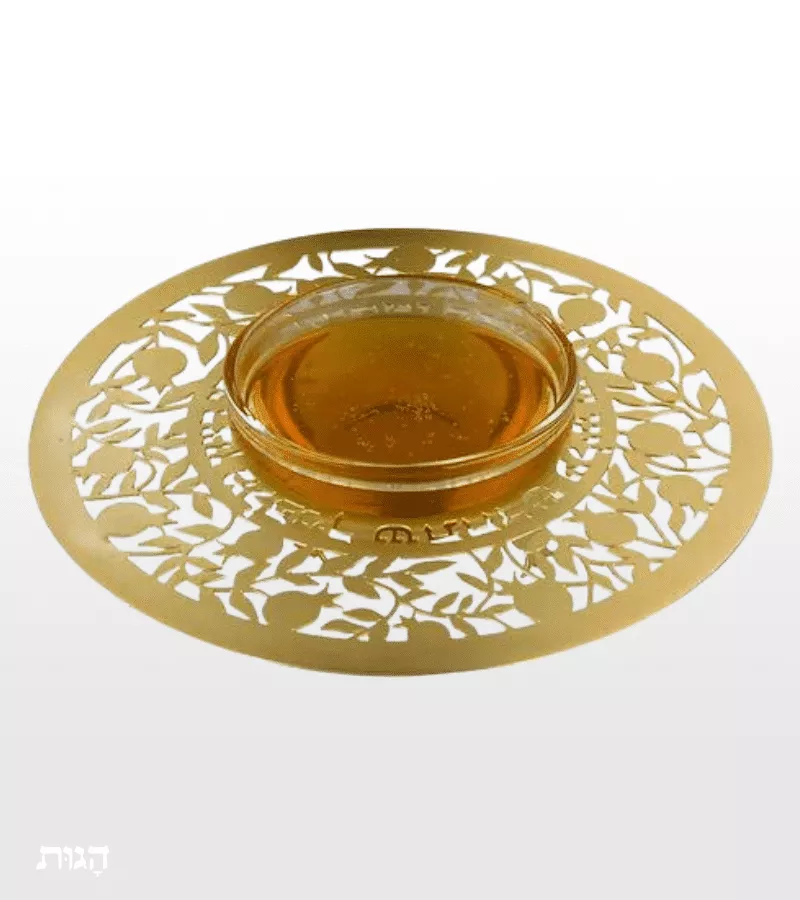 דבשייה לראש השנה של האמנית דורית ידאיקה, הדבשייה עשויה נירוסטה בציפוי זהב ועם מגזרת רימונים.